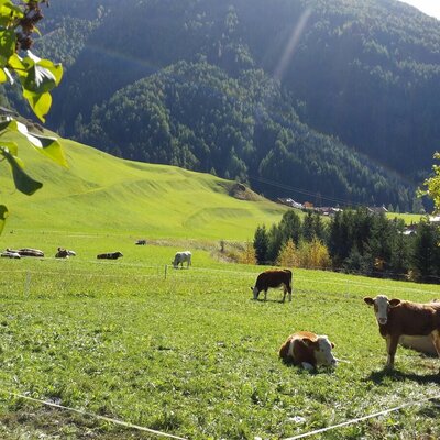 Nei mesi estivi le nostre mucche sono all'alpeggio nella Dorfertal. Per i bambini, una volta alla settimana in estate organizziamo un'esperienza a contatto con gli animali nella nostra fattoria biologica. Partecipa, ne sarai entusiasta.