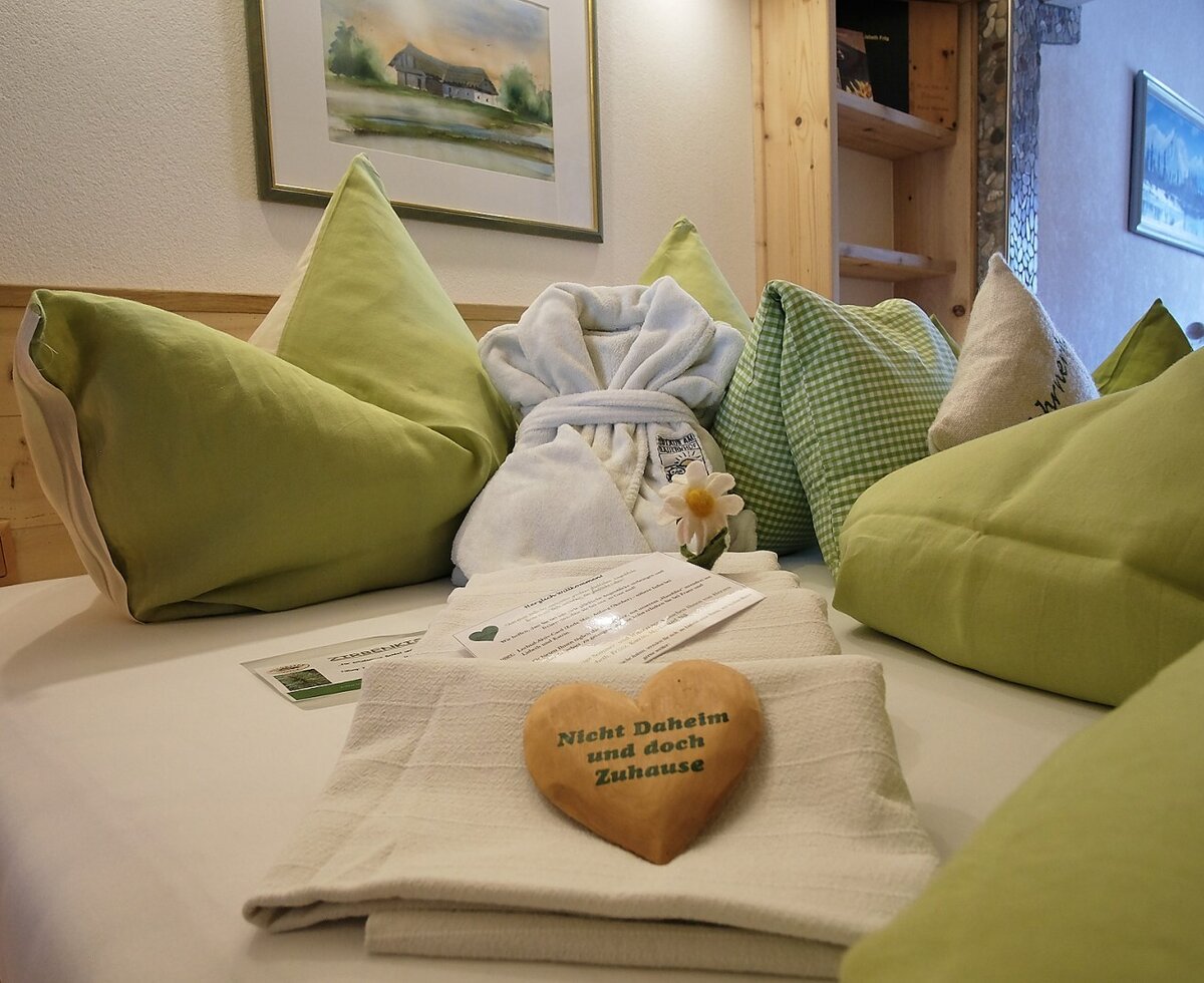 Pratichiamo la sostenibilità, dalla cucina con ingredienti naturali secondo antiche ricette all'acquisto consapevole di prodotti regionali. La nostra fattoria è dotata di un impianto solare, i nostri ospiti dormono in lenzuola biologiche e godono di camere arredate con amore e in modo sostenibile.